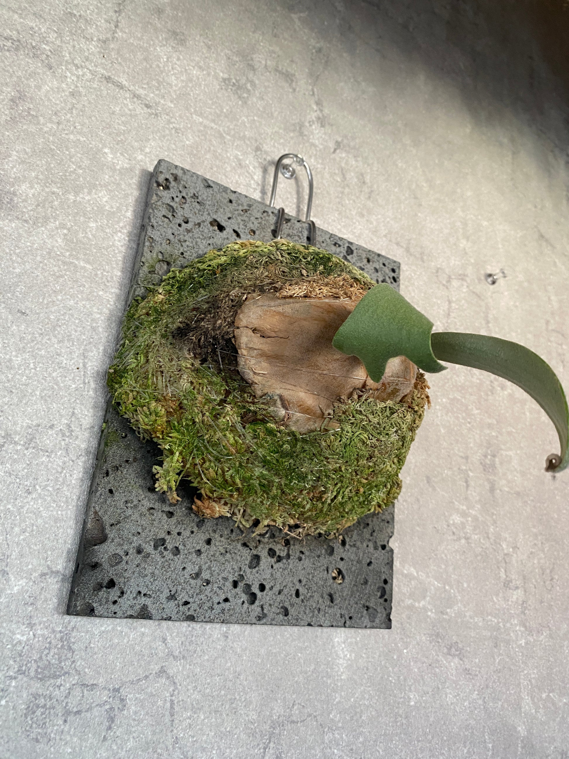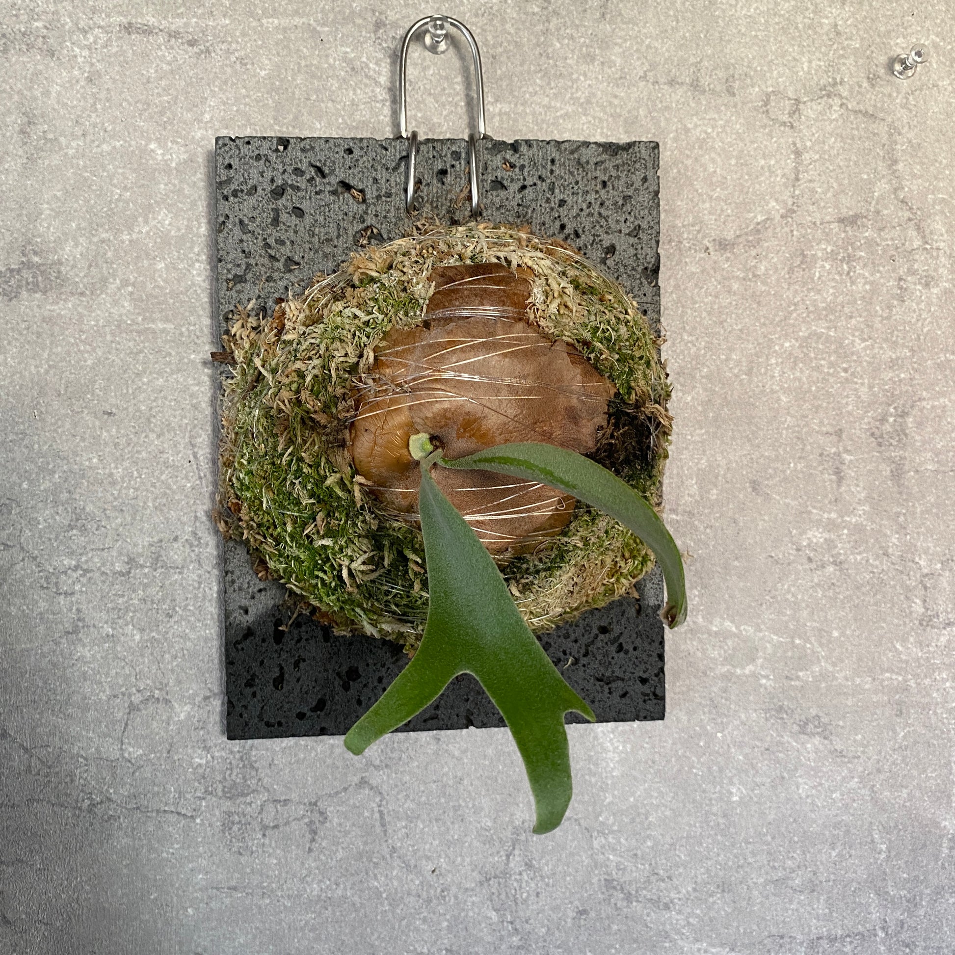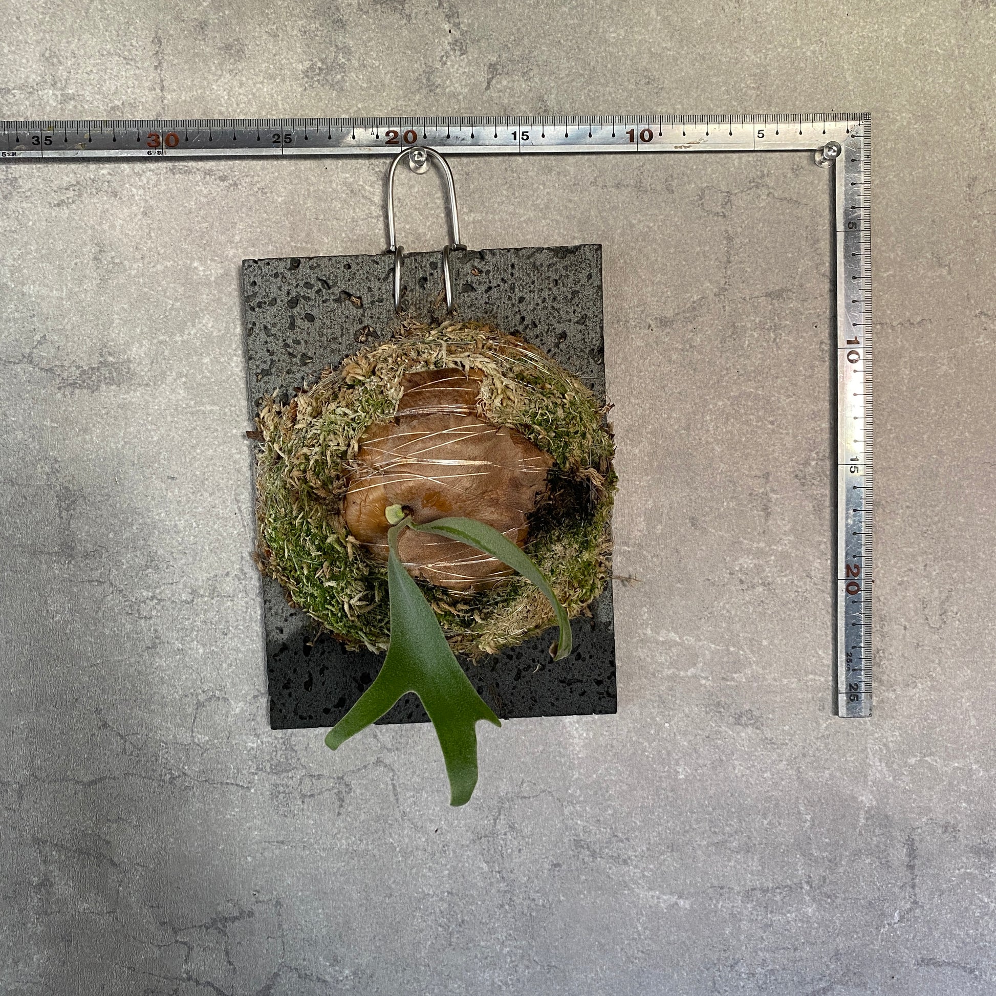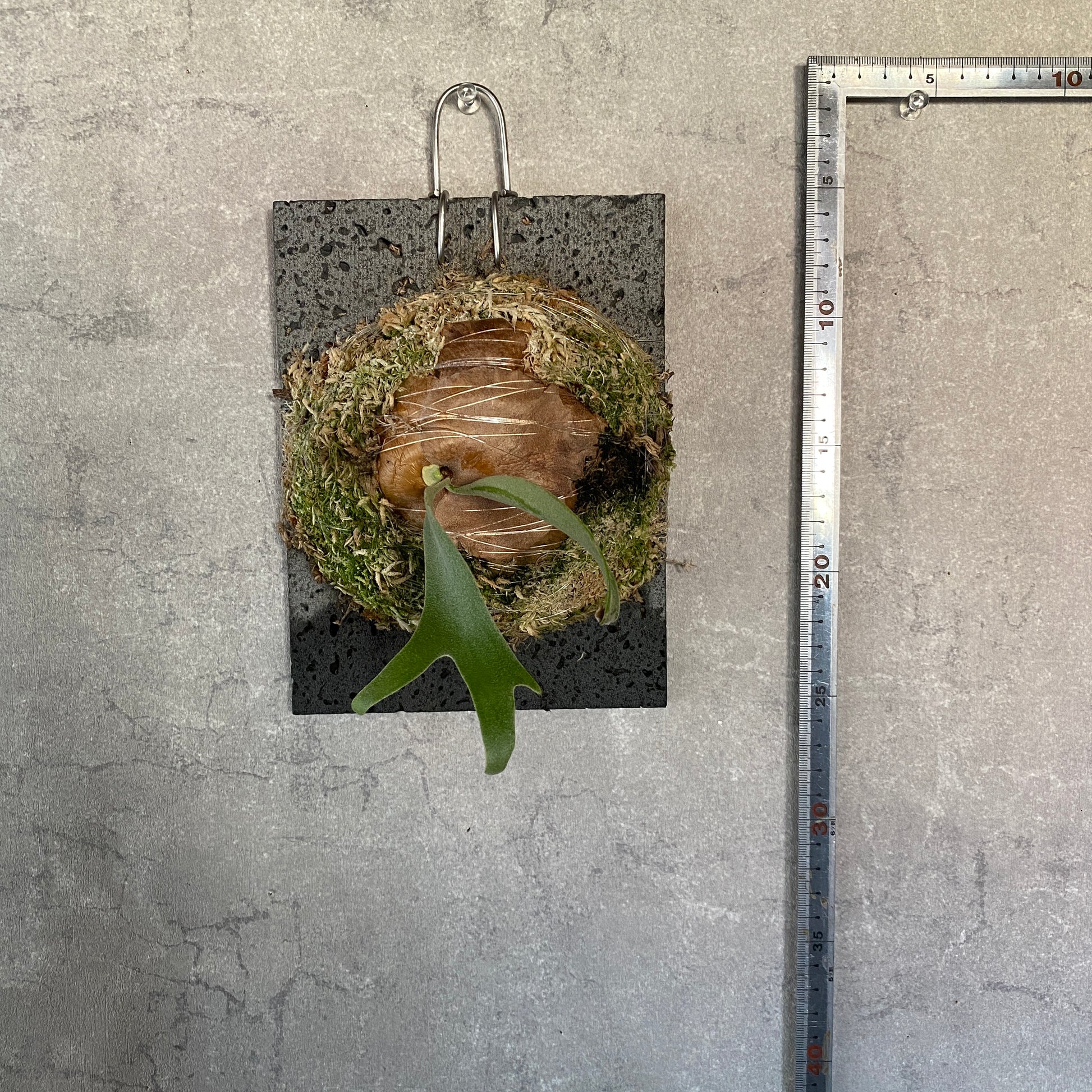ビカクシダの希少品種で台湾原産の月光爪哇という品種の子株を石のプレートに板付けしてあります。