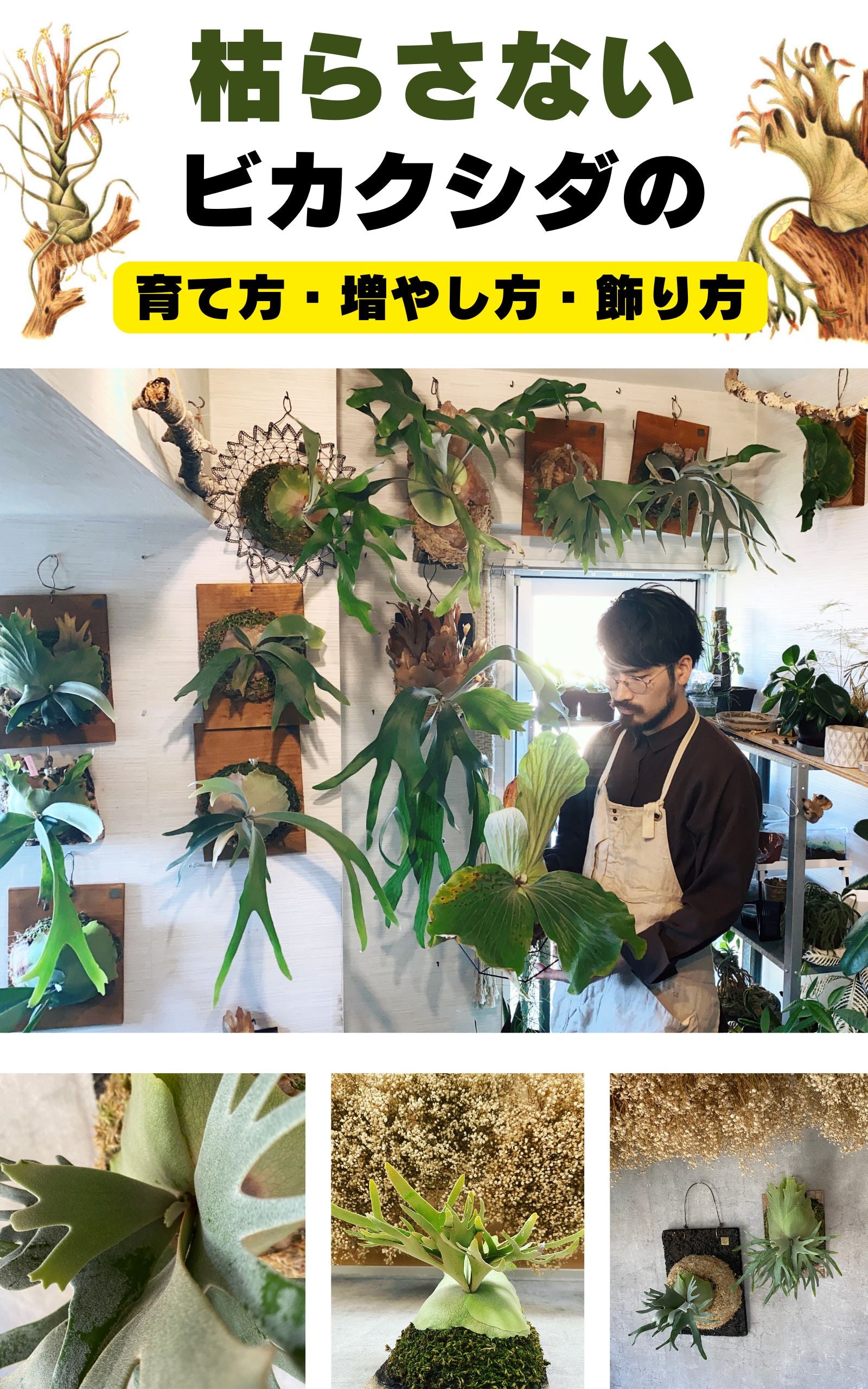 ビカクシダの基本的な育て方から、枯らさずに美しく成長させるコツ、胞子培養の方法、インテリアとしての飾り方まで、初心者にもわかりやすく解説しています。